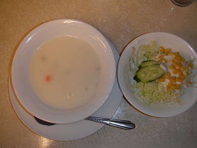 左)なんとなく胡椒ふらなきゃ飲めないマッシュルーム味のスープとサラダ